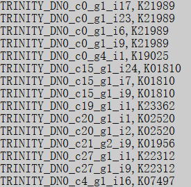 使用上述第二条命令的输出则是会把分数超过阈值且 e 值小于 1e-3 的那些注释输出成一份一基因对一 KO 的格式,这种格式方便我们处理用于后续的富集分析。