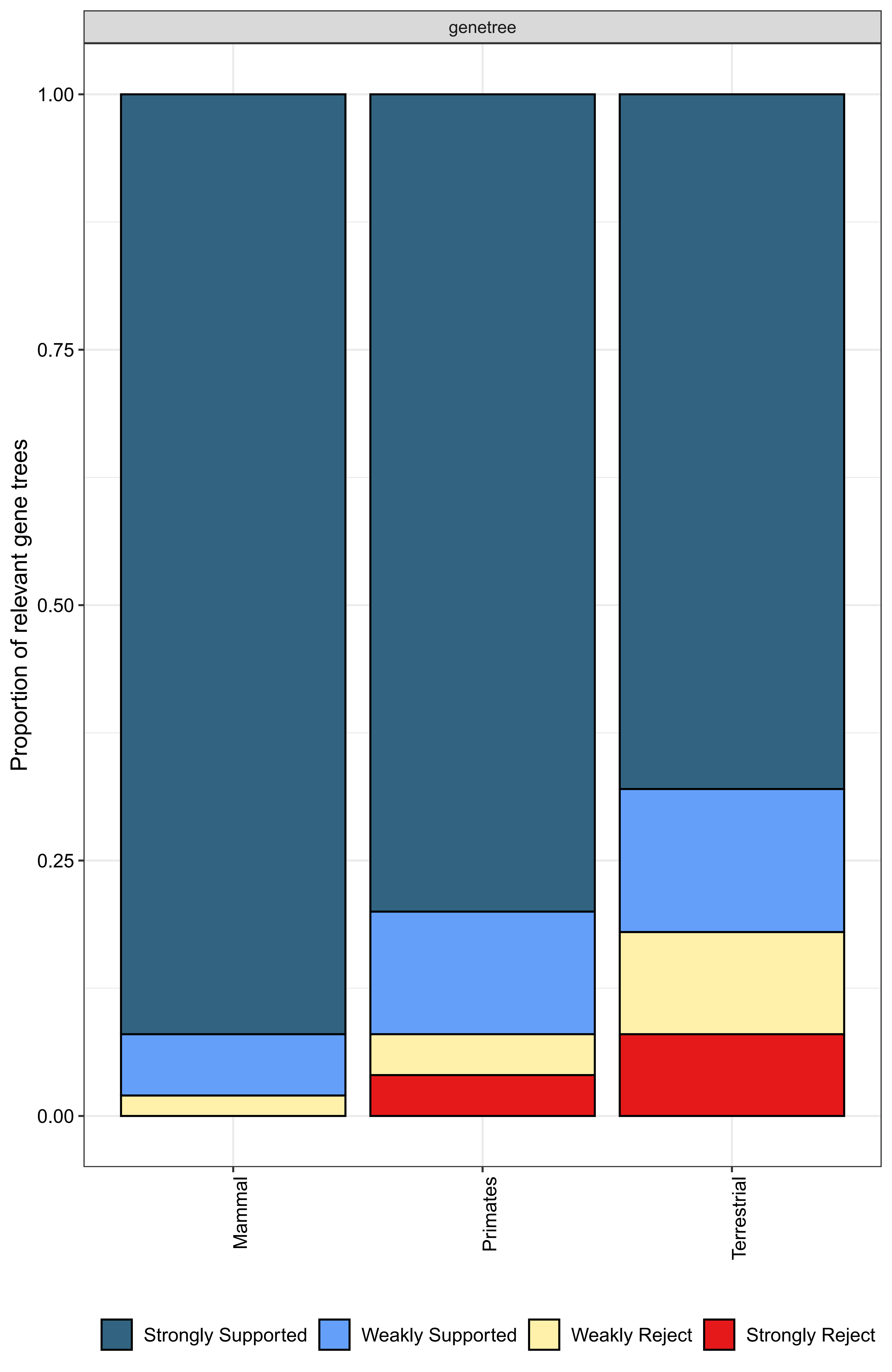 其中有部分基因并不支持我们所定义的支(例如哺乳类和陆生类有部分基因显示强拒绝),但大多数还是符合先验预期的。